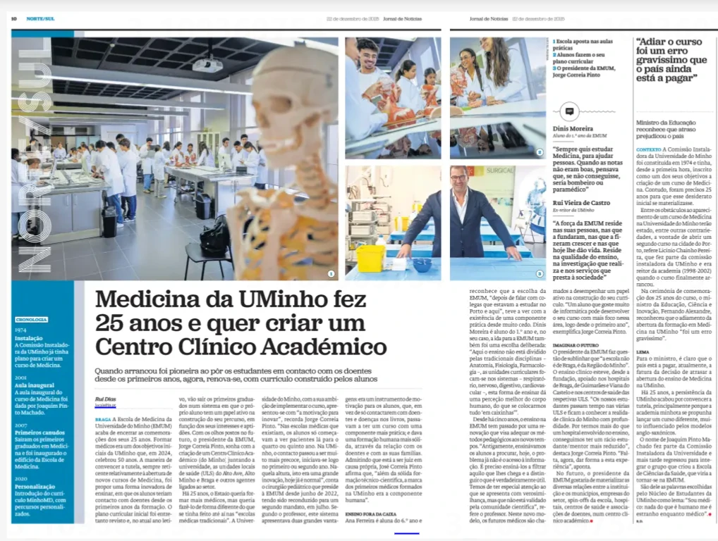 A Escola de Medicina da Universidade do Minho (EMUM) acaba de encerrar as comemorações dos seus 25 anos. Formar médicos era um dos objetivos iniciais da UMinho que, em 2024, celebrou 50 anos. A maneira de convencer a tutela, sempre reticente relativamente à abertura de novos cursos de Medicina, foi propor uma forma inovadora de ensinar, em que os alunos teriam contacto com doentes desde os primeiros anos da formação. O plano curricular inicial foi entretanto revisto e, no atual ano letivo, vão sair os primeiros graduados num sistema em que o próprio aluno tem um papel ativo na construção do seu percurso, em função dos seus interesses e aptidões. Com os olhos postos no futuro, o presidente da EMUM, Jorge Correia Pinto, sonha com a criação de um Centro Clínico Académico (do Minho) juntando a universidade, as unidades locais de saúde (ULS) do Alto Ave, Alto Minho e Braga e outros agentes ligados ao setor.